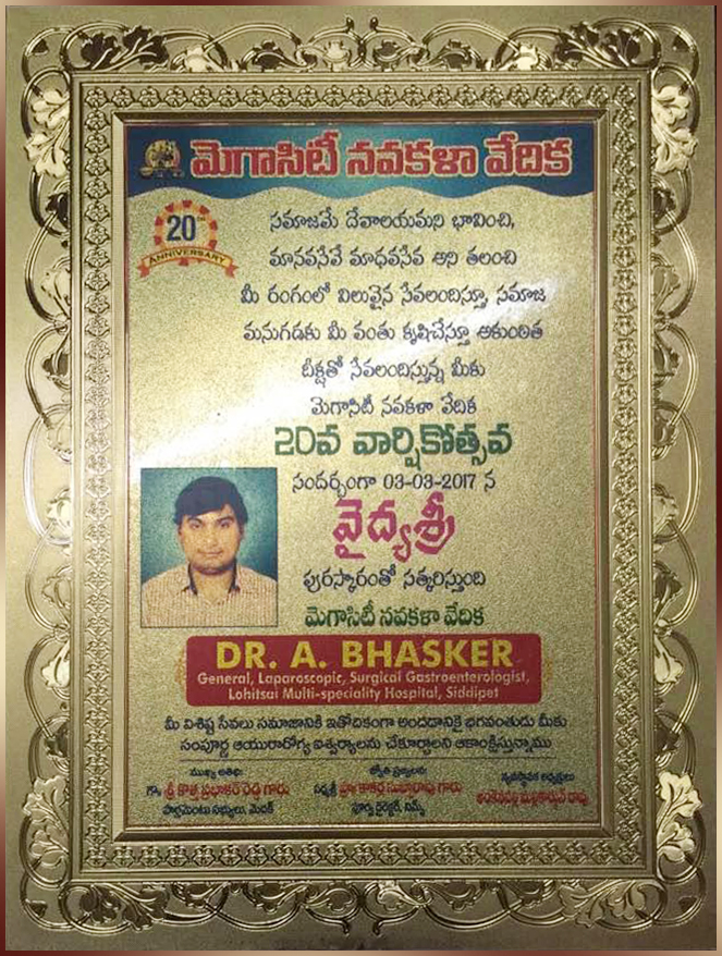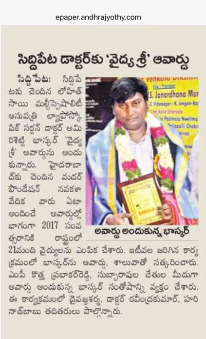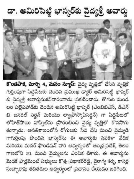Dr. Bhaskar, a highly esteemed figure in the medical community of Siddipet, was honored with the prestigious Vaidya Sri Award in 2017 by Navakalavedika and Mother Foundation for his outstanding contributions to healthcare services in the region. His relentless dedication and exceptional skills have positively impacted the lives of countless individuals, providing them with access to quality medical care and improving health outcomes. Dr. Bhaskar's compassionate approach and unwavering commitment to serving the community have earned him widespread admiration and respect. His receipt of the Vaidya Sri Award serves as a testament to his invaluable contributions and unwavering commitment to the well-being of the people of Siddipet.