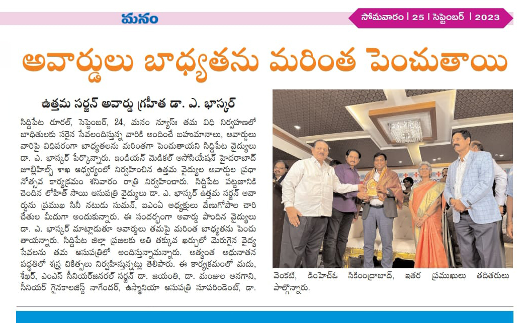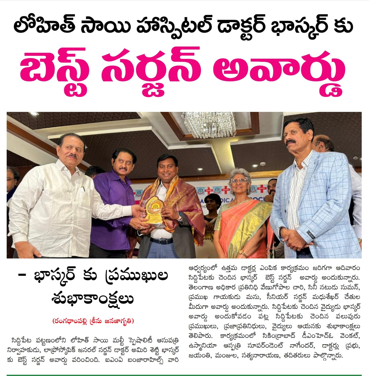 Dr. Bhaskar's dedication to providing exceptional healthcare services to the community, particularly to those in need, was recognized with the prestigious Best Surgeon Award by the Indian Medical Association Hyderabad in 2023. His unwavering commitment to making healthcare accessible and affordable for the underprivileged has been a cornerstone of his practice. Dr. Bhaskar's compassion and skill as a surgeon have not only transformed the lives of countless individuals but have also set a benchmark for excellence in healthcare provision. Through his tireless efforts and innovative approaches, he has demonstrated a profound understanding of the healthcare challenges facing society and has worked tirelessly to address them. The award serves as a testament to Dr. Bhaskar's exemplary service and unwavering dedication to improving the health and well-being of society, particularly the economically disadvantaged.