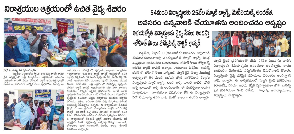 Lohithsai Hospital, under the compassionate leadership of Dr. Bhaskar, has been at the forefront of corporate social responsibility (CSR), making significant contributions to society through various initiatives. Through free health camps and medication distribution, the hospital ensures that even the most vulnerable members of the community have access to essential healthcare services. Additionally, their commitment to education is evident through the provision of scholarships, empowering deserving students to pursue their dreams without financial barriers. Dr. Bhaskar's kindness extends beyond medical care; he actively supports old age homes and orphanages, providing comfort and care to those in need. With a heart full of empathy, Dr. Bhaskar tirelessly serves on the front lines, embodying the hospital's dedication to improving the lives of individuals and communities. His leadership and philanthropic efforts are a shining example of how healthcare institutions can make a meaningful difference in society.