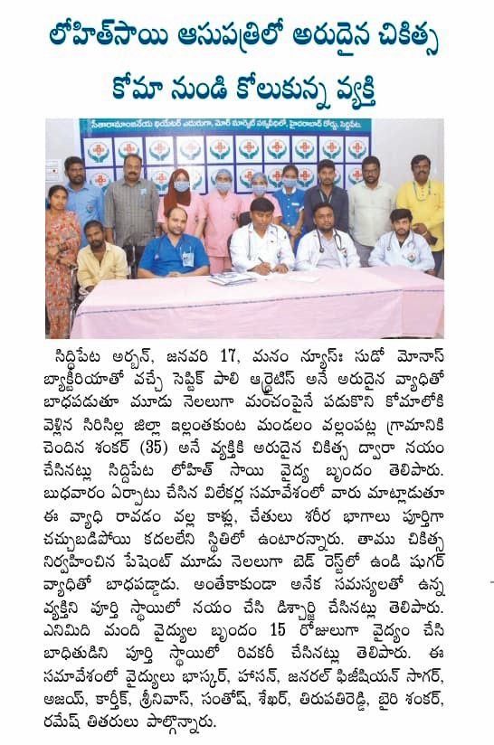 In a triumphant battle against adversity, Dr. Bhaskar and his exceptional team of eight doctors at Lohithsai Hospital successfully saved the life of a patient on the brink of coma due to sudo monos bacteria poly septic arthritis. Despite facing additional complications such as diabetes and severe skin issues, the team exhibited unwavering determination and expertise in their treatment approach. Through their tireless efforts and unwavering commitment, they emerged victorious in this life-saving endeavor, exemplifying the hospital's ethos of being warriors dedicated to preserving the lives of their patients.